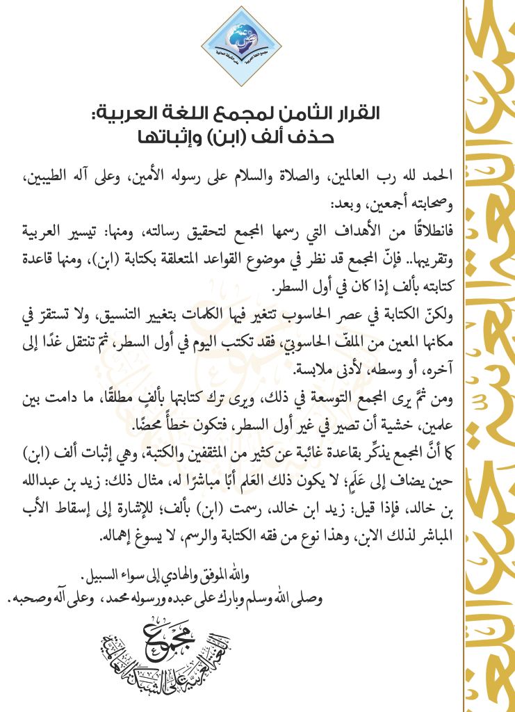 القرار الثامن لمجمع اللغة العربية بمكة المكرمة: حذف ألف ابن وإثباتها